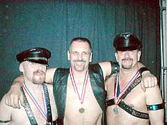 ![]() IML contestants L-R) in attendance at the SF leather contest Mr Cell Block Leather 2003, Mr Mexico Leather 2003, Mr DC Eagle 2003 |
