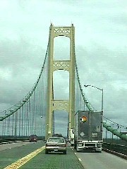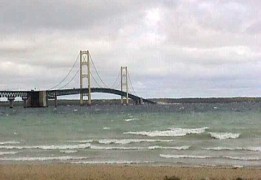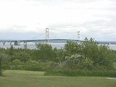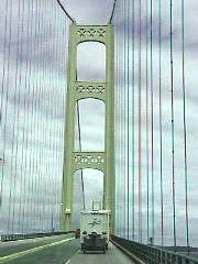 Woke up early on Tuesday morning. Decided to do McDonalds for a change. It was going to be a very senic day - all the way up the Lake Michigan shoreline to Macinac City and across the world’s longest suspension bridge. When we get there it’s very cloudy and raining mist. So we stop and shop and have fresh fish and chips and some souvenir shopping.